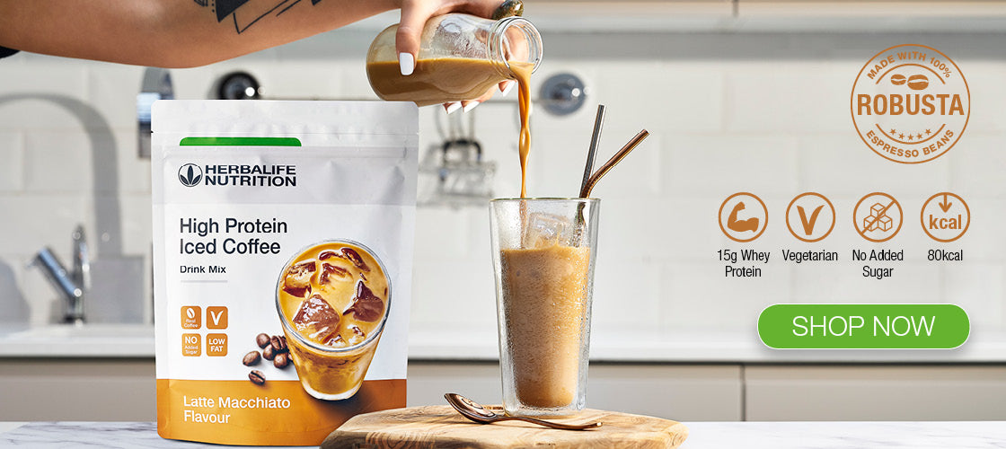 Fill your shaker cup with 250ml cold water. Add 1 scoop of High Protein Iced Coffee. Shake and pour over ice. If you don’t have a shaker cup, blend on low speed for 5 seconds.